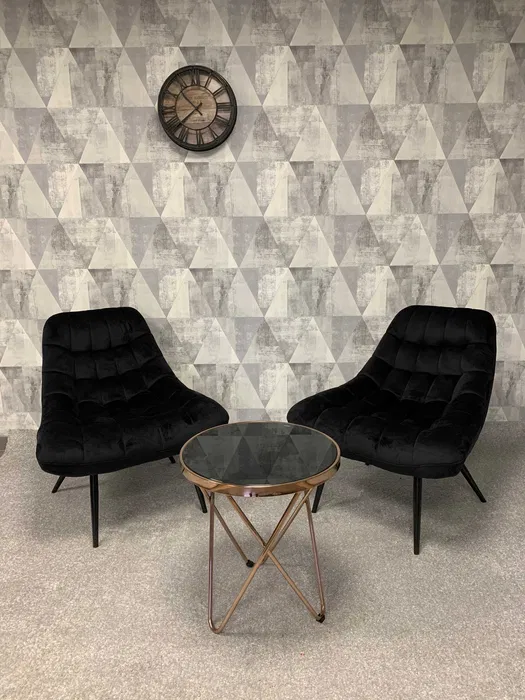 Fotele idealnie wypełnią każdą przestrzeń, a mały elegancki stolik będzie praktycznym designerkim dodatkiem. Fotele zwracają swoją uwagę dzięki welurowej tkaninie, którą są pokryte, oraz dzięki ozdobnym pikowaniom.
